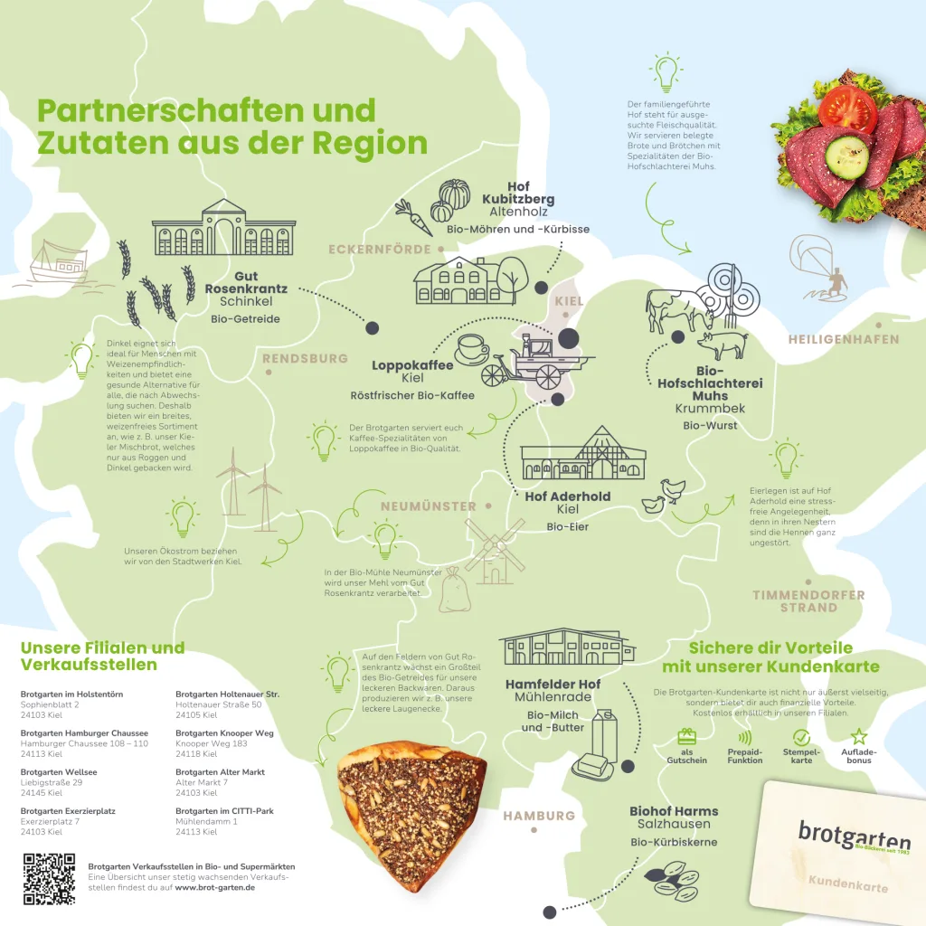 Um das „neue“ Brotgarten in der Kieler Region bekannt zu machen und den Bekanntheitsgrad von Brotgarten zu steigern, wurde ein aufwendiger „Vorstellungsflyer“ konzipiert und gestaltet: ein Landkartenfalz, bestehend aus 18 faltbaren Seiten – quadratisch gefaltet, praktisch im Handtaschenformat.