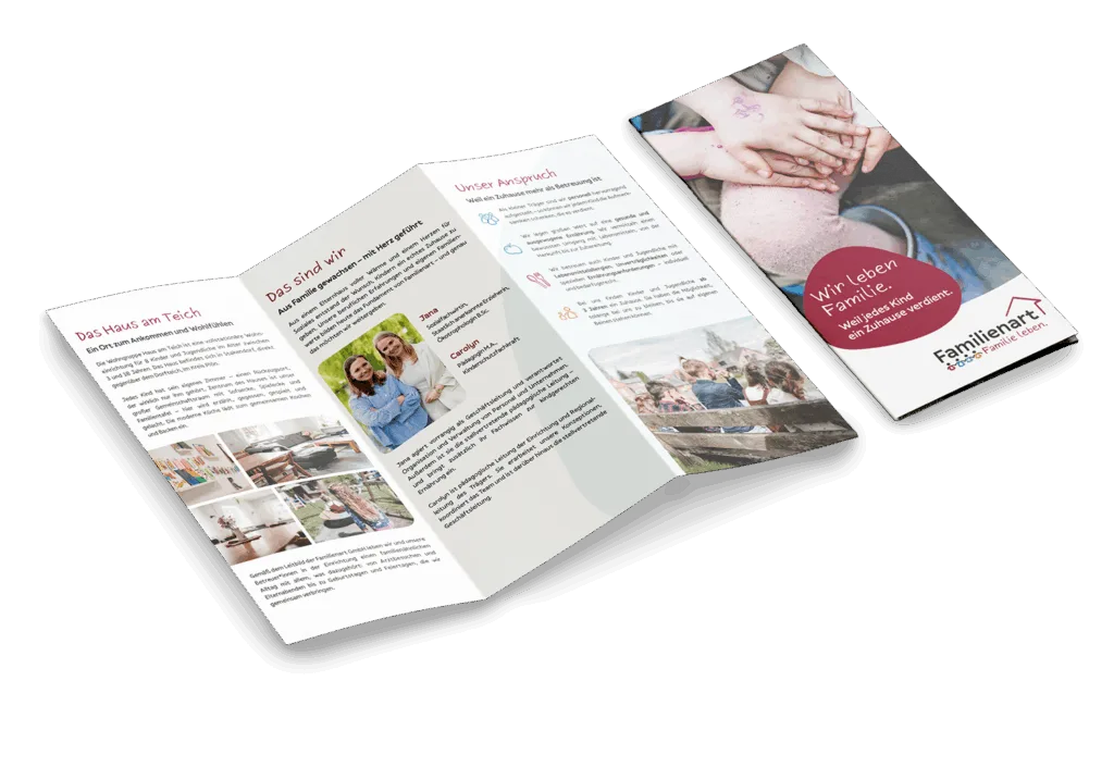Außerdem haben wir einen Flyer gestaltet, in dem die Familienart ihr Konzept und die Einrichtung Haus am Teich vorstellt. Das klassische DIN-lang-Format wird durch freundliche Fotos aus dem Alltag im Haus lebendig. Ein klarer Aufbau sorgt für Übersichtlichkeit, während organische Formen, abgerundete Bildelemente und handgezeichnete Icons dem Flyer eine verspielte, kindgerechte Note verleihen.